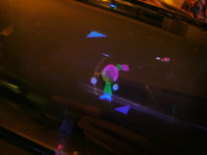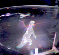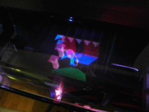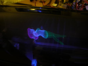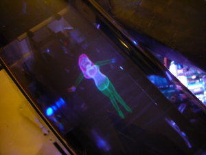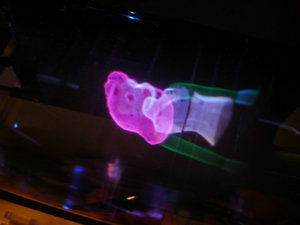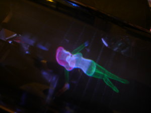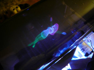 A "swimming girl" (3D computer model) is programmed to "swim" in the display space, photographed from different angles and distances. The girl always faces "top". Eyes and lips can be seen if looking closely.