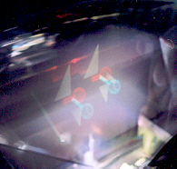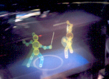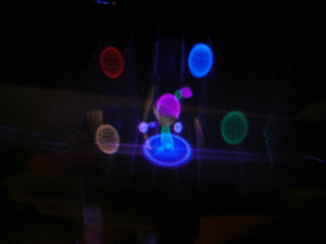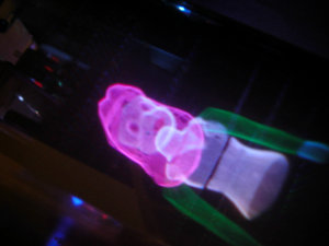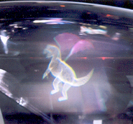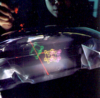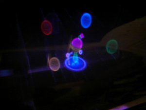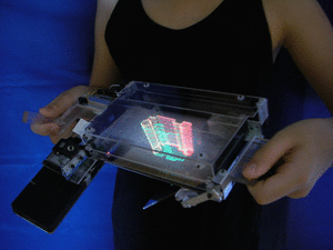 A viewer points a laser pointer into the display volume of a 6" desktop prototype, which displays a molecule-like model.