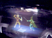 Cyra the Archer (a simple game character), standing on a circular pad, is surrounded by 4 spheres, photographs taken from one side of the display volume at different view angles.