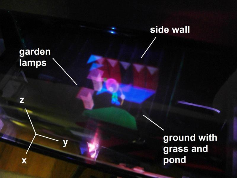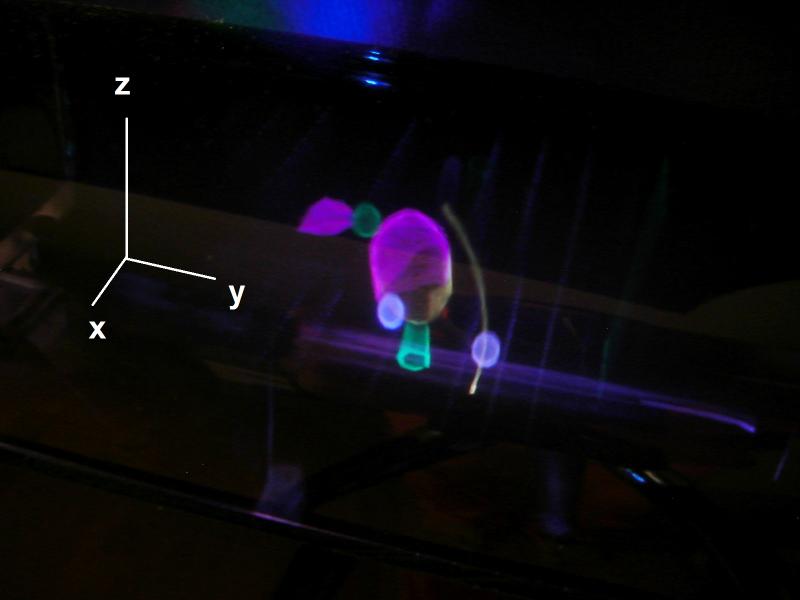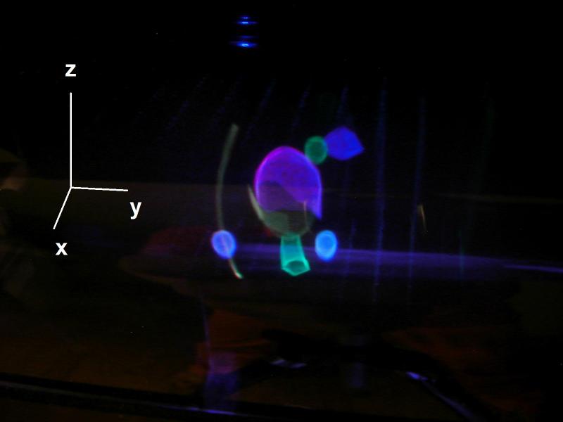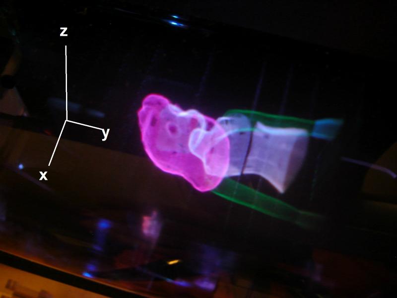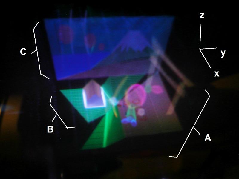Note: The surface of the moving screen is parallel to x-y plane. The 2D image plane in C is formed completely by the sweeping of a thin linear stripe area at the edge of the screen in z-direction. This shows that texture mapping can be made on planes of any orientation in the display volume.