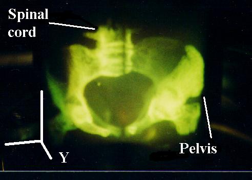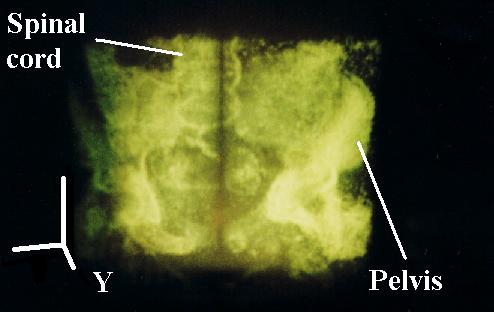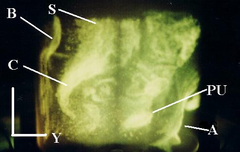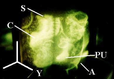 (2) The lower abdomen region of the Visible Human data (axial CT, male) was processed (gray tone re-scaled and roughly segmented) and displayed on one of our VID prototypes. Photo (a), (b) and (c) show the same volumetric 3D image photographed from three different directions. The Visible Human faces Y direction. The white coordinate frame indicates the body orientation relative to the camera. (A - abdomen skin; B - back skin; C - Coccyx; PU - pubic bone; S - Spinal cord)