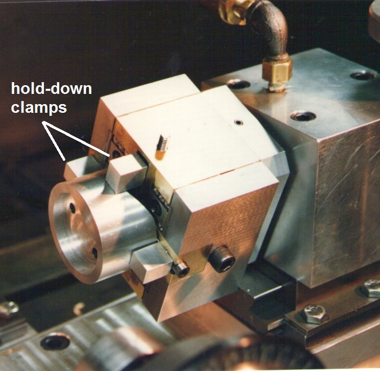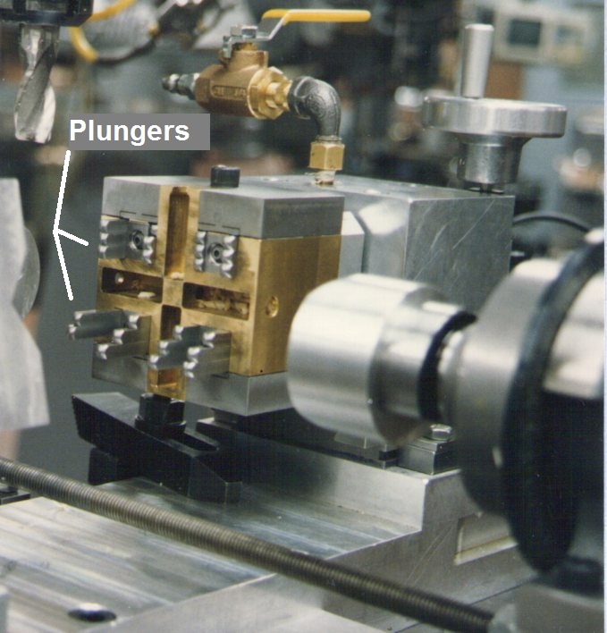 Details of the jaw: Plungers (left) and hold-down clamps (right)