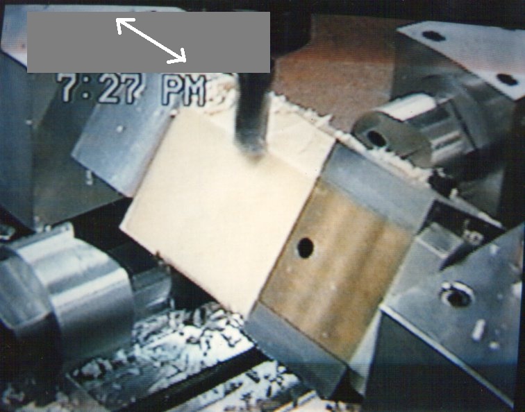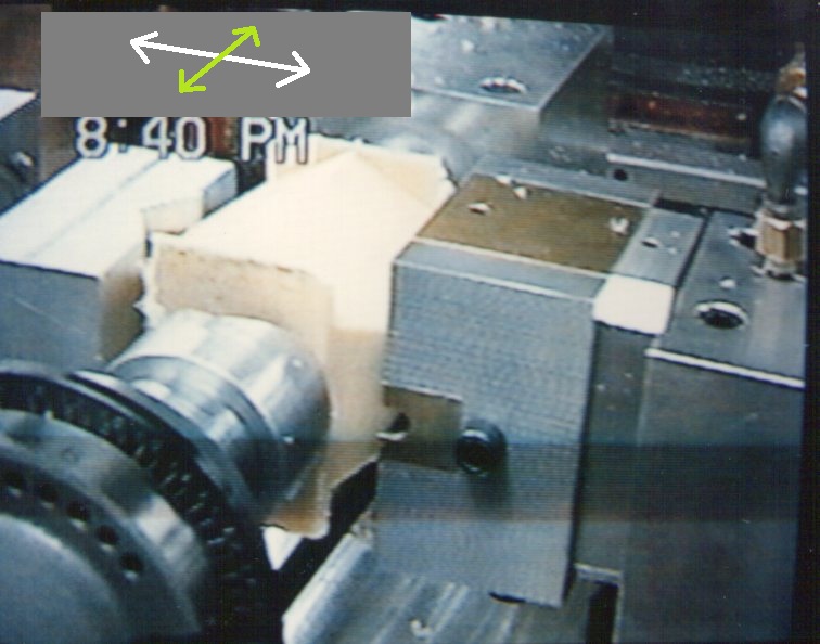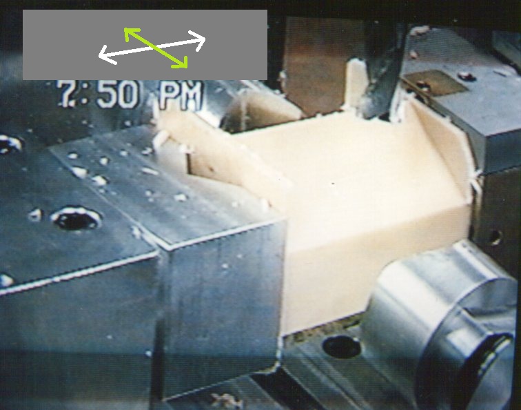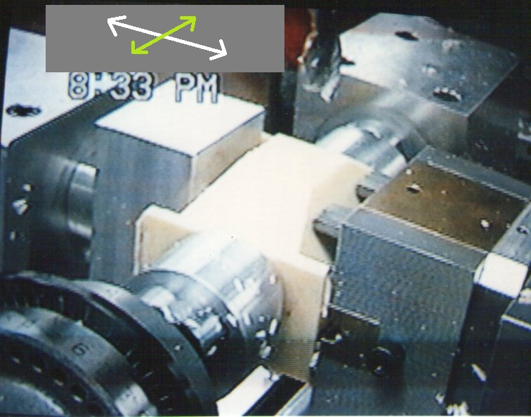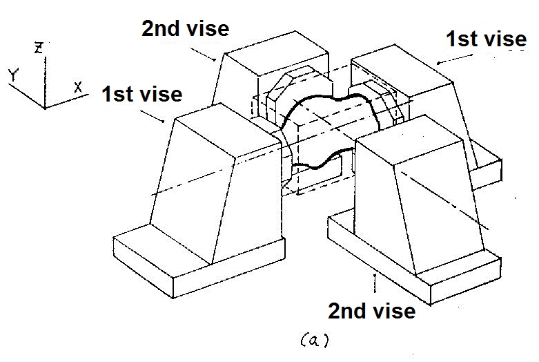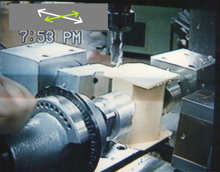 Video shots of machining a 14-face part. Arrows indicating 1st pair of vise or 2nd pair of vise in action and the directions.